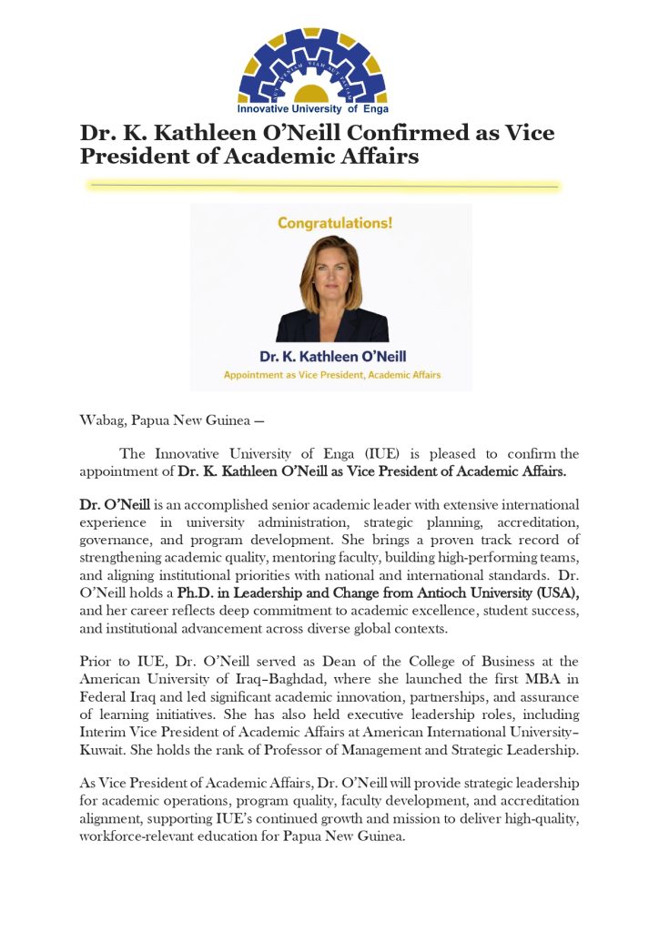 Dr. K. Kathleen O’Neill Confirmed as Vice President of Academic Affairs iueAdmin Previous post 2026 IUE ANNUAL TUITION & FEE SCHEDULE January 26, 2026 Next post Academic Year 2026 Tuition Notice to Students January 28, 2026 You may also like Academic Year 2026 Tuition Notice to Students January 28, 2026 2026 IUE ANNUAL TUITION & FEE SCHEDULE January 23, 2026 University Celebrates Dr. Kapil Dave’s Book Publication and Patent Registration January 23, 2026